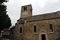Le clocher, coiffé en bâtière[4] et habité par la cloche de bronze Bénédicte (refondue en 1897), est de plan carré. Son élévation présente deux niveaux. Les parements aveugles du niveau inférieur sont animés d'une arcature lombarde typique du premier art roman. Le niveau supérieur, percé de baies géminées, présente au sud un chapiteau sculpté de quatre masques grimaçants.