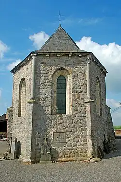 Au nord-est, la chapelle présente un beau chevet gothique composé d'une travée de chœur et d'une abside à trois pans[2] dont les angles sont marqués chacun d'un petit contrefort portant une colonnette à base torique surmontée d'un chapiteau à crochets, dans le genre des contreforts à colonnette que l'on voit au chevet de l'église Saint-Médard de Jodoigne[2],[3].