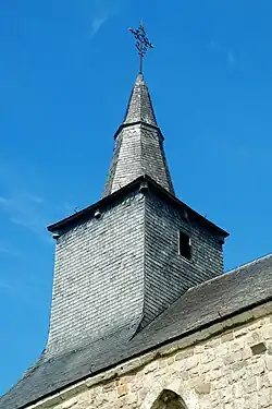 À l'ouest, la chapelle présente une façade percée d'une porte de style classique à encadrement de pierre bleue mouluré[2] surmontée d'une baie ogivale. La façade, percée dans sa partie haute de deux trous de boulin (trous destinés à ancrer les échafaudages), se termine par un clocheton dont la base carrée couverte d'ardoises est percée sur ses faces antérieure et postérieure d'une minuscule baie campanaire à abat-son et surmontée d'une élégante flèche octogonale.