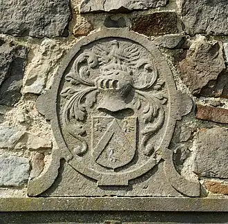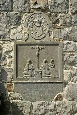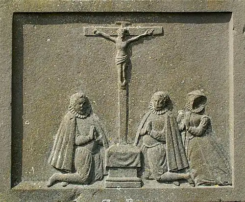 Le monument consiste en un bas-relief représentant les trois personnages agenouillés au pied de la croix, surmonté d'un blason composé d'un écu, d'un heaume, de lambrequins et d'un cimier, et orné à sa base d'une inscription funéraire :