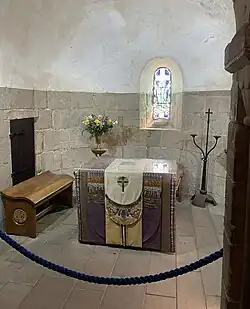 Le petit édifice en pierre irrégulière a une certaine similitude avec des chapelles écossaise et irlandaise celtiques antérieures. La structure rectangulaire avec une largeur intérieure de 3 m a une porte d’entrée d’un côté à l’arrière de la nef, qui est de 4,87 m de long, puis un chancel vouté typiquement roman de 1,52 m de large avec des moulures en forme de chevron décorant la voûte au-dessus des colonnes de chaque côté donne sur un sanctuaire en abside de 3 m de long et d’un rayon de 1,52 m. Le mur nord a été renouvelé, et les trois murs extérieurs restants, ainsi que le mur du chœur, font 61 cm d’épaisseur. Cinq petites fenêtres en plein cintre et le cintre au-dessus de la porte d’entrée de confirment le style roman.