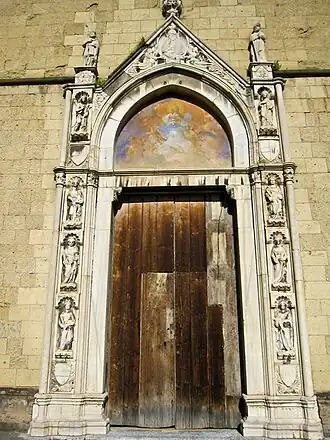 Le portail d'entrée en marbre est d'inspiration gothique de la première moitié du XIVe siècle. Il est décoré de statuettes de saints. À gauche, les niches abritent de bas en haut celles de Sainte Agathe, Sainte Catherine et Sainte Barbe; celles de droite, Sainte Anastasie, Sainte Apollonie et Sainte Ursule. La partie supérieure présente quatre statues dans les deux colonnes. En haut, la partie inférieure présente la scène de l'Annonciation, en haut à gauche, Saint Jean-Baptiste et à droite, Saint Augustin. La partie centrale du tympan montre une fresque de la Vierge en gloire attribuée à Leonardo da Besozzo. Elle est surmontée d'un bas-relief de deux anges soutenant un ovale avec le visage du Christ bénissant et tout en haut une statuette de la Vierge.