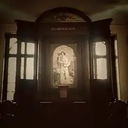 L'autel est disposé, sur le modèle chrétien, au fond de la pièce afin que le "grand prêtre" de l'Humanité soit tourné vers son auditoire. Il se rapproche très fortement, dans sa conception, de l'autel de la chapelle jouxtant les fonts baptismaux de l'Église Saint-Paul Saint-Louis. Au-dessus de la corbeille de fleurs du fronton, on peut lire une invocation de Dante dans la Divine Comédie: « Vergine Madre, Figlia del tuo Figlio ! »[13]. Sur le bas, figure le vœu de Thomas a Kempis dans L'Imitation de Jésus Christ: « Amem te plus quam me nec me nisi propter te »[14].