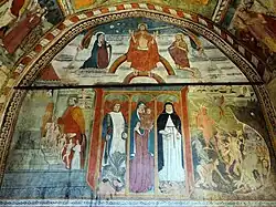Sur ce mur est peinte une représentation du Jugement dernier s'inspirant de l'Évangile de saint Matthieu (24,30-31 et 25, 31 ...) et de l'Apocalypse de saint Jean (1,16). Le Christ-juge est placé au centre et en haut. Il domine et préside la cène, s'appuyant sur deux arcs-en-ciel concentriques représentant les nuées, avec de part et d'autre des anges faisant retentir leurs trompettes pour rassembler les élus des quatre vents (Mt,24,30) à l'ordre (« Debout les morts, venez au Jugement de Dieu » Surgite mortui, venite ad iudiciu Dei). Son manteau est ouvert, Ses bras levés pour montrer les stigmates. À sa gauche, à hauteur de sa bouche a été placée l'épée à deux tranchants de l'Apocalypse. À sa droite est placée une tige de lys, entre Lui et la Vierge agenouillée et priant. De l'autre côté se tient saint Jean-Baptiste agenouillé en prière. De sa bouche sortent les paroles du récit de l'Évangéliste : « Alors le roi dira à ceux qui sont à sa droite, Venez, les bénis, prendre possession du royaume qui vous a été préparé dès l'origine du monde » (Mt, 25,34) (Venite benediti patris mei acipite regnum vobis paratum ab origine mundi), et les boucs à sa gauche, « Allez les maudits au feu éternel » (Mt,25,41) (Descendite malediti in ignem eternum). En dessous, à la droite du Christ, un groupe d'élus guidés par un ange disposés en file montent les marches de l'escalier menant au Paradis dont saint Pierre s'apprête à ouvrir la porte. À la gauche du Christ, les damnés sont représentés dans un grouillement avec des diables les précipitant dans la gueule du Léviathan les conduisant en Enfer.