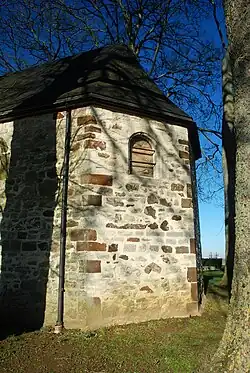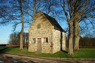 La façade occidentale, remaniée au XIXe siècle[4], est percée d'une petite porte rectangulaire et de deux petites baies carrées. Chacune de ces trois ouvertures est surmontée d'un arc de décharge en briques qui contraste avec la maçonnerie de moellons. Elle est cantonnée de chaînages d'angle réalisés au moyen de gros blocs de grès ferrugineux.