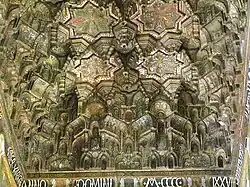 Le plafond à muqarnas est entièrement peint d'un décor figuratif. Sur fond or sont peintes des étoiles et des croix imbriquées dans une dominante de rouge, bleu, noir et blanc. Il offre un rare rapprochement entre la tradition et l'esthétique islamiques et celles, byzantines, des mosaïques qu'il jouxte directement.