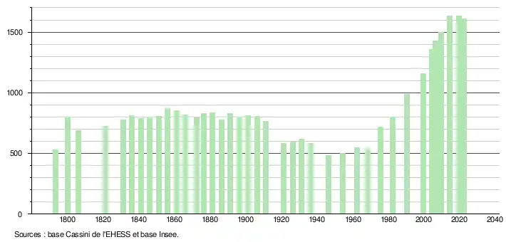 L'évolution du nombre d'habitants est connue à travers les recensements de la population effectués dans la commune depuis 1793. Pour les communes de moins de 10 000 habitants, une enquête de recensement portant sur toute la population est réalisée tous les cinq ans, les populations de référence des années intermédiaires étant quant à elles estimées par interpolation ou extrapolation[24]. Pour la commune, le premier recensement exhaustif entrant dans le cadre du nouveau dispositif a été réalisé en 2004[25].