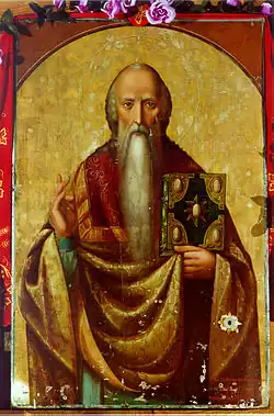 | Attributs | robe épiscopale, couronne du martyre, Bible ou Évangile, s'adressant au Sauveur, mains droite bénissant les deux natures, pied droit soumettant le démon |