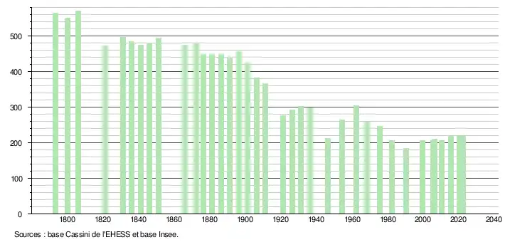 L'évolution du nombre d'habitants est connue à travers les recensements de la population effectués dans la commune depuis 1793. Pour les communes de moins de 10 000 habitants, une enquête de recensement portant sur toute la population est réalisée tous les cinq ans, les populations de référence des années intermédiaires étant quant à elles estimées par interpolation ou extrapolation[18]. Pour la commune, le premier recensement exhaustif entrant dans le cadre du nouveau dispositif a été réalisé en 2005[19].