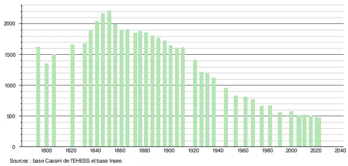 L'évolution du nombre d'habitants est connue à travers les recensements de la population effectués dans la commune depuis 1793. Pour les communes de moins de 10 000 habitants, une enquête de recensement portant sur toute la population est réalisée tous les cinq ans, les populations de référence des années intermédiaires étant quant à elles estimées par interpolation ou extrapolation[22]. Pour la commune, le premier recensement exhaustif entrant dans le cadre du nouveau dispositif a été réalisé en 2005[23].