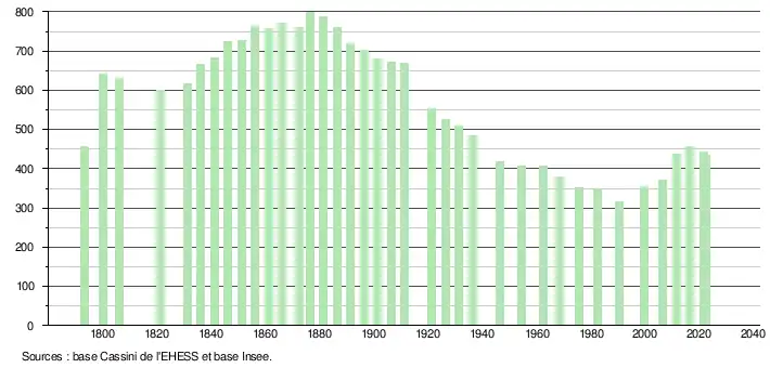 L'évolution du nombre d'habitants est connue à travers les recensements de la population effectués dans la commune depuis 1793. Pour les communes de moins de 10 000 habitants, une enquête de recensement portant sur toute la population est réalisée tous les cinq ans, les populations de référence des années intermédiaires étant quant à elles estimées par interpolation ou extrapolation[14]. Pour la commune, le premier recensement exhaustif entrant dans le cadre du nouveau dispositif a été réalisé en 2006[15].