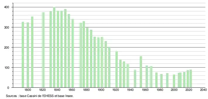 L'évolution du nombre d'habitants est connue à travers les recensements de la population effectués dans la commune depuis 1793. Pour les communes de moins de 10 000 habitants, une enquête de recensement portant sur toute la population est réalisée tous les cinq ans, les populations de référence des années intermédiaires étant quant à elles estimées par interpolation ou extrapolation[32]. Pour la commune, le premier recensement exhaustif entrant dans le cadre du nouveau dispositif a été réalisé en 2008[33].