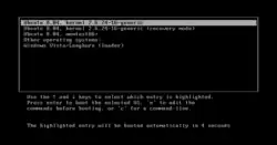 Interface au démarrage de GRUB, l'un des chargeurs d'amorçage les plus courants, permettant de choisir le lancement parmi les différents systèmes.