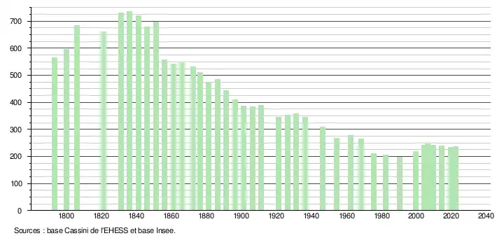 L'évolution du nombre d'habitants est connue à travers les recensements de la population effectués dans la commune depuis 1793. Pour les communes de moins de 10 000 habitants, une enquête de recensement portant sur toute la population est réalisée tous les cinq ans, les populations de référence des années intermédiaires étant quant à elles estimées par interpolation ou extrapolation[15]. Pour la commune, le premier recensement exhaustif entrant dans le cadre du nouveau dispositif a été réalisé en 2004[16].