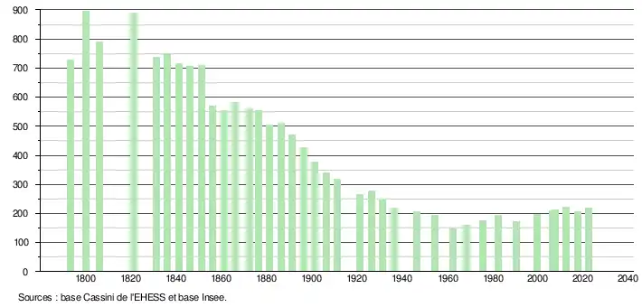 L'évolution du nombre d'habitants est connue à travers les recensements de la population effectués dans la commune depuis 1793. Pour les communes de moins de 10 000 habitants, une enquête de recensement portant sur toute la population est réalisée tous les cinq ans, les populations de référence des années intermédiaires étant quant à elles estimées par interpolation ou extrapolation[23]. Pour la commune, le premier recensement exhaustif entrant dans le cadre du nouveau dispositif a été réalisé en 2007[24].