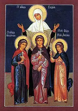 « Réjouis-toi, Sophia, car ton nom signifie sagesse et c'est avec sagesse que tu as élevé tes filles ; réjouis-toi, Sophia, qui conduit les mères fidèles à la sage éducation de leurs enfants ; réjouis-toi, toi qui nous apprends à chercher le Seigneur et qui rends nos âmes vivantes. Réjouissez-vous, Pistis, Elpis et Agapis, avec Sophie, votre très sage mère. Les vertus de vos noms, vous les avez montrées par vos actes dans vos dévotions ; réjouissez-vous, comme trois fleurs qui s'épanouissent sur une seule branche féconde. Réjouissez-vous, vous qui nous fortifiez dans les vertus de la foi, de l'espérance et de la charité. Réjouissez-vous, graines de vertus, qui abreuvez nos âmes d'une boisson vivifiante.