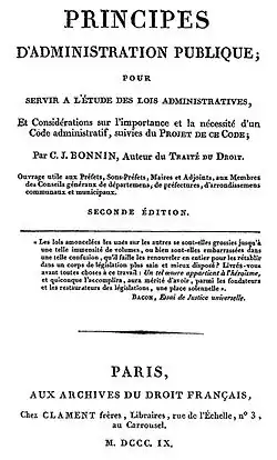 - Principes d'Administration Publique, pour servir à l’Étude des Lois Administratives, et Considérations sur l’Importance et la Nécessité d’un Code Administratif, suivies du Projet de ce Code. Ouvrage utile aux Préfets, Sous-Préfets, Maires et Adjoints, aux Membres des Conseils généraux de départements, de préfectures, d’arrondissements, communaux et municipaux. À Paris, chez Clément Frères, Libraires. 1809. Seconde édition.