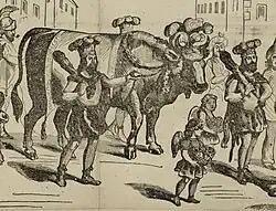 - 1 2 Programme officiel du cortège et de la marche des Bœufs gras, éditeur : « Se trouve chez Durand, rue Jacques de Brosse, 10, Paris » 1858, estampe, format 19,4 × 37,8 cm (image), 50,4 × 37,8 cm (texte).