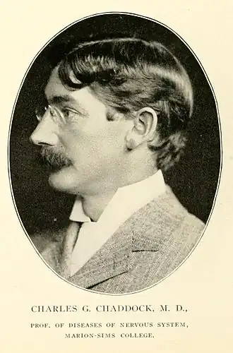 Charles Gilbert Chaddock est né en 1861 à Jonesville, au Michigan. Il a obtenu son diplôme de médecine en 1885 et a travaillé au North Michigan Asylum à Traverse City. Il a passé un an à étudier en Europe en 1888. Il est devenu professeur de neurologie et de psychiatrie au Marion-Sims College de l'Université St. Louis.