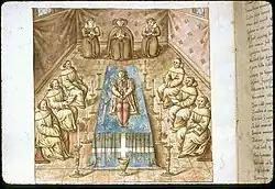 Enluminure du manuscrit Carmen de tristibus Galliae, 1577, Bibliothèque municipale de Lyon, ms. 0156, fo 29 vo.