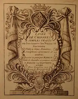 - Livre de chiffres a double traits, où l'on trouve les noms & surnoms. : Utile aux peintres, sculpteurs, graveurs et autres. Dedié a Monseigneur le Dauphin. Paris : l'auteur 1685 Contient une dédicace au dauphin, 79 f, de chiffres entrelacés, une section de nouveaux dessins dédiés à la Dauphine, suivi d'une table des chiffres fleuronnés et des chiffres des noms, suivi d'une dédicace au prince Louis Auguste de Bourbon, suivi de 53 f de chiffres. Exemplaire disponible en ligne dans la collection Gaelic Books de la National Library of Scotland