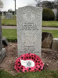 « No. 871 Pte. Charles Melvin, R. Highrs. (Kirriemuir) - For most conspicuous bravery, coolness and resource in action. Pte. Melvin's company had advanced to within fifty yards of the front-line trench of a redoubt, where, owing to the intensity of the enemy's fire, the men were obliged to lie down and wait for reinforcements. Pte. Melvin, however, rushed on by himself, over ground swept from end to end by rifle and machine-gun fire. On reaching the enemy trench, he halted and fired two or three shots into it, killing one or two enemy, but as the others in the trench continued to fire at him, he jumped into it, and attacked them with his bayonet in his hand, as, owing to his rifle being damaged, it was not “fixed." On being attacked in this resolute manner most of the enemy fled to their second line, but not before Pte. Melvin had killed two more and succeeded in disarming eight unwounded and one wounded. Pte. Melvin bound up the wounds of the wounded man, and then driving his eight unwounded prisoners before him, and supporting the wounded one, he hustled them out of the trench, marched them in and delivered them over to an officer. He then provided himself with a load of ammunition and returned to the firing line where he reported himself to his platoon sergeant. All this was done, not only under intense rifle and machine-gun fire, but the whole way back Pte. Melvin and his party were exposed to a very heavy artillery barrage fire. Throughout the day Pte. Melvin greatly inspired those near him with confidence and courage[1]. »