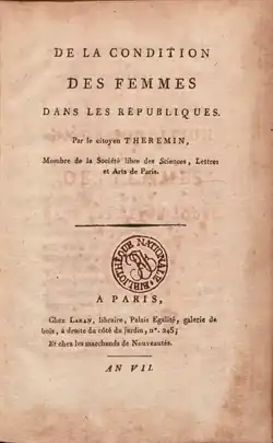 - De la condition des femmes dans une république, Paris, Laran, , 85 p., in-8º (OCLC 777231024, lire en ligne sur Gallica).
