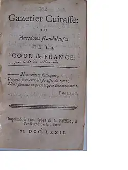 Arrivé à Londres dans le plus grand dénuement en 1770, il fait la connaissance d'un couple de Français, le sieur et la dame de Courcelle, qui lui fournissent des anecdotes scandaleuses et l'encouragent à écrire[13]. Ainsi naît le Gazetier cuirassé vers les mois d'avril-mai 1771. Dès le mois d'août 1771, l'ouvrage est à Paris. Le censeur royal François-Louis Claude Marin le décrit au duc d'Aiguillon, alors à la tête du secrétariat d'État des affaires étrangères, comme un livre dangereux. S'il est un temps attribué au duc de Lauraguais, qui s'en irrite[14], la police de Paris comme les rédacteurs des Mémoires secrets savent que la « brochure est du sieur Morande ci-devant escroc à Paris, & qui ne l’est pas moins à Londres, puisqu’il passe pour constant qu’il a eu mille guinées pour la vente de cette rapsodie : les libraires de votre capitale n’eussent pas fait un pareil marché de dupe[15]. »
