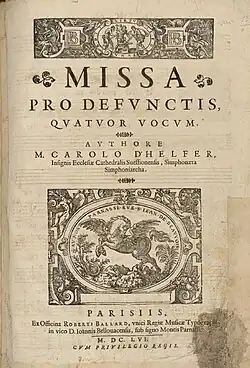 - Missa pro defunctis, quatuor vocum. Robert III Ballard, 1656. 1 vol. 2°. Guillo 2003 n° 1656-G, RISM H 4985. Numérisée sur Internet Archive et sur Gallica.