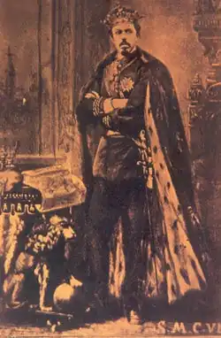 Le , Charles franchit la frontière espagnole depuis la France et pénètre en Navarre par la Venta de Laputsagarra. L'accueil que lui réservent ses partisans revêt l'allure de celui qu'on doit à un chef d'État, ce qui lui permet d’obtenir le titre de roi et d’être reconnu par le Nord du pays comme le souverain légitime sous le nom de Charles VII. À seulement vingt-cinq ans, on croirait plus âgé ce colosse d'un mètre quatre-vingt-cinq[19]. Son épouse Marguerite, installée à Pau (oú naitront ses filles Béatrice et Alice), se dévoue pour créer les services sanitaires de l'armée carliste[19]. Le gouvernement carliste siège à Estella-Lizarra, en Navarre, et Charles y pose les bases d'un État organisé, avec une fonction publique, une police, une justice, un service postal, une monnaie, l'escudo, une école militaire et une université. Les populations locales encensent le roi Charles VII dont la réputation commence à se propager dans le reste de l'Espagne[20].