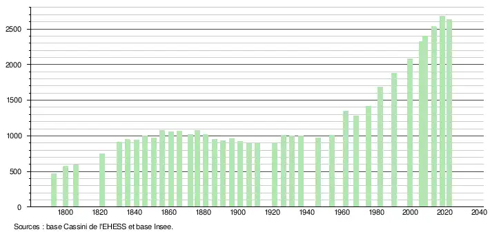 L'évolution du nombre d'habitants est connue à travers les recensements de la population effectués dans la commune depuis 1793. Pour les communes de moins de 10 000 habitants, une enquête de recensement portant sur toute la population est réalisée tous les cinq ans, les populations de référence des années intermédiaires étant quant à elles estimées par interpolation ou extrapolation[21]. Pour la commune, le premier recensement exhaustif entrant dans le cadre du nouveau dispositif a été réalisé en 2008[22].