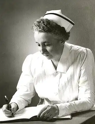 - ↑ Cohen, Yolande et Éric Vaillancourt, « L'identité professionnelle des infirmières canadiennes-françaises à travers leurs revues (1924-1956). », Revue d'histoire de l'Amérique française, , p. 537–570 (doi:10.7202/305601ar)