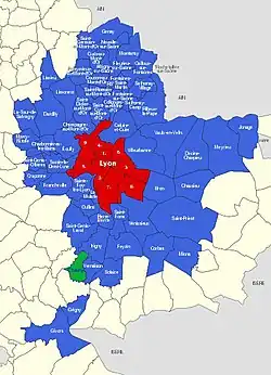 - ↑ « Liste des communes composant l'aire d'attraction de Lyon », sur le site de l'Insee (consulté le ).