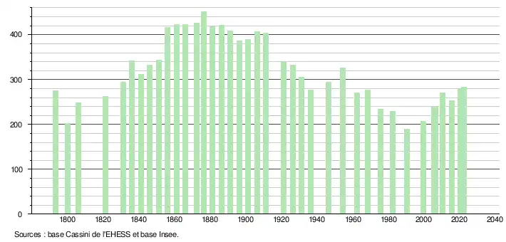 L'évolution du nombre d'habitants est connue à travers les recensements de la population effectués dans la commune depuis 1793. Pour les communes de moins de 10 000 habitants, une enquête de recensement portant sur toute la population est réalisée tous les cinq ans, les populations de référence des années intermédiaires étant quant à elles estimées par interpolation ou extrapolation[17]. Pour la commune, le premier recensement exhaustif entrant dans le cadre du nouveau dispositif a été réalisé en 2005[18].