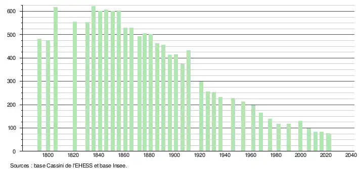 L'évolution du nombre d'habitants est connue à travers les recensements de la population effectués dans la commune depuis 1793. Pour les communes de moins de 10 000 habitants, une enquête de recensement portant sur toute la population est réalisée tous les cinq ans, les populations de référence des années intermédiaires étant quant à elles estimées par interpolation ou extrapolation[21]. Pour la commune, le premier recensement exhaustif entrant dans le cadre du nouveau dispositif a été réalisé en 2006[22].