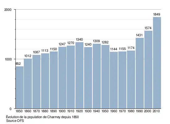 Le graphique suivant résume l'évolution de la population de Charmey entre 1850 et 2010[5] :