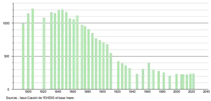 L'évolution du nombre d'habitants est connue à travers les recensements de la population effectués dans la commune depuis 1793. Pour les communes de moins de 10 000 habitants, une enquête de recensement portant sur toute la population est réalisée tous les cinq ans, les populations de référence des années intermédiaires étant quant à elles estimées par interpolation ou extrapolation[24]. Pour la commune, le premier recensement exhaustif entrant dans le cadre du nouveau dispositif a été réalisé en 2008[25].