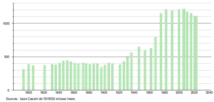 L'évolution du nombre d'habitants est connue à travers les recensements de la population effectués dans la commune depuis 1793. Pour les communes de moins de 10 000 habitants, une enquête de recensement portant sur toute la population est réalisée tous les cinq ans, les populations de référence des années intermédiaires étant quant à elles estimées par interpolation ou extrapolation[20]. Pour la commune, le premier recensement exhaustif entrant dans le cadre du nouveau dispositif a été réalisé en 2005[21].