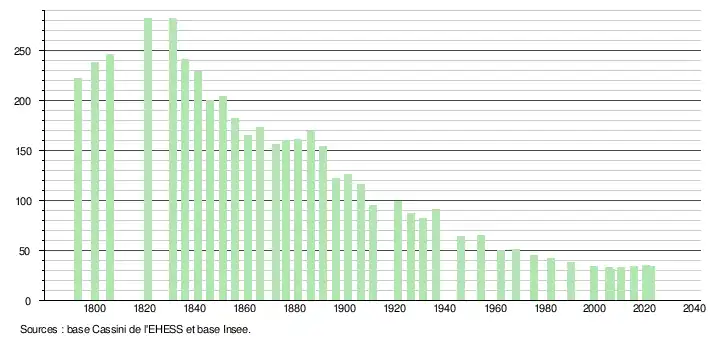 L'évolution du nombre d'habitants est connue à travers les recensements de la population effectués dans la commune depuis 1793. Pour les communes de moins de 10 000 habitants, une enquête de recensement portant sur toute la population est réalisée tous les cinq ans, les populations de référence des années intermédiaires étant quant à elles estimées par interpolation ou extrapolation[19]. Pour la commune, le premier recensement exhaustif entrant dans le cadre du nouveau dispositif a été réalisé en 2005[20].