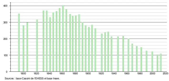 L'évolution du nombre d'habitants est connue à travers les recensements de la population effectués dans la commune depuis 1793. À partir du , les populations légales des communes sont publiées annuellement dans le cadre d'un recensement qui repose désormais sur une collecte d'information annuelle, concernant successivement tous les territoires communaux au cours d'une période de cinq ans. Pour les communes de moins de 10 000 habitants, une enquête de recensement portant sur toute la population est réalisée tous les cinq ans, les populations légales des années intermédiaires étant quant à elles estimées par interpolation ou extrapolation[6]. Pour la commune, le premier recensement exhaustif entrant dans le cadre du nouveau dispositif a été réalisé en 2007[7],[Note 1].