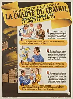 Pétain évoque la question sociale dans certains de ses discours, notamment le à Saint-Étienne : il préconise un État qui donne une impulsion à l'action sociale, une « communauté de travail » au sein de l'entreprise, base de « l'organisation professionnelle », annonce la création d'« organismes simples » qui ne seront pas « des organisations de classe » mais seront des organismes dans lesquels patrons, cadres et ouvriers « rechercheront ensemble les solutions des problèmes actuels dans une commune volonté de justice »[γ].