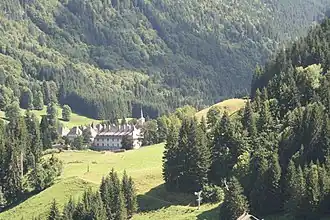 La Chartreuse du Reposoir vue depuis le lac avoisinant, 10 juillet 2023