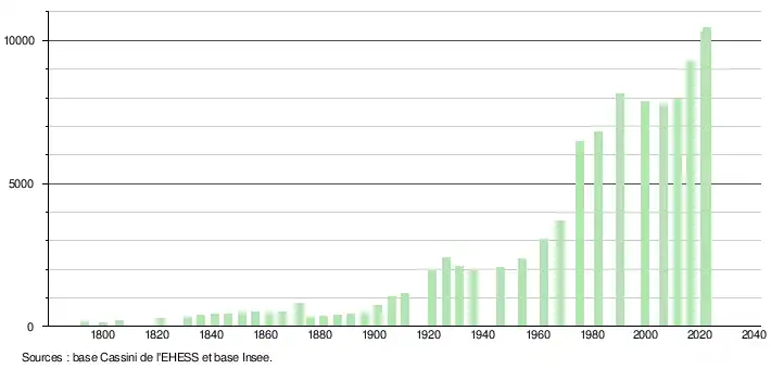 - ↑ Par convention dans Wikipédia, le principe a été retenu de n’afficher dans le tableau des recensements et le graphique, pour les populations de référence postérieures à 1999, que les populations correspondant à une enquête exhaustive de recensement pour les communes de moins de 10 000 habitants, et que les populations des années 2006, 2011, 2016, etc. pour les communes de plus de 10 000 habitants, ainsi que la dernière population de référence publiée par l’Insee pour l'ensemble des communes.