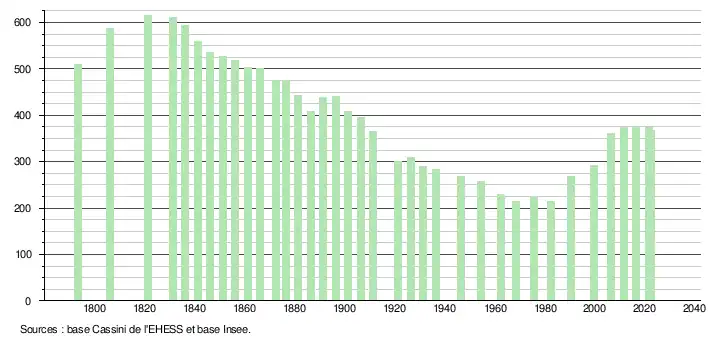 L'évolution du nombre d'habitants est connue à travers les recensements de la population effectués dans la commune depuis 1793. Pour les communes de moins de 10 000 habitants, une enquête de recensement portant sur toute la population est réalisée tous les cinq ans, les populations de référence des années intermédiaires étant quant à elles estimées par interpolation ou extrapolation[29]. Pour la commune, le premier recensement exhaustif entrant dans le cadre du nouveau dispositif a été réalisé en 2006[30].