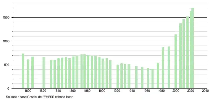 L'évolution du nombre d'habitants est connue à travers les recensements de la population effectués dans la commune depuis 1793. Pour les communes de moins de 10 000 habitants, une enquête de recensement portant sur toute la population est réalisée tous les cinq ans, les populations de référence des années intermédiaires étant quant à elles estimées par interpolation ou extrapolation[32]. Pour la commune, le premier recensement exhaustif entrant dans le cadre du nouveau dispositif a été réalisé en 2005[33].