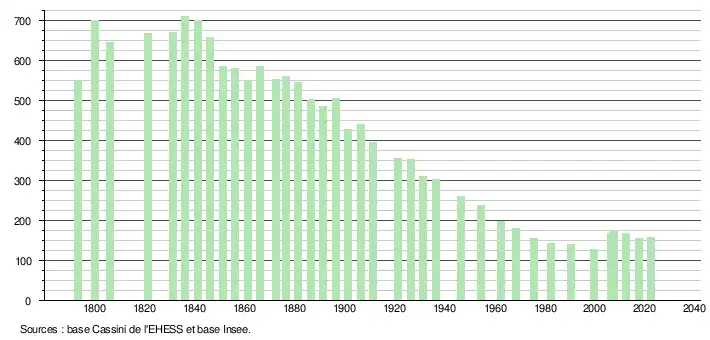 L'évolution du nombre d'habitants est connue à travers les recensements de la population effectués dans la commune depuis 1793. Pour les communes de moins de 10 000 habitants, une enquête de recensement portant sur toute la population est réalisée tous les cinq ans, les populations de référence des années intermédiaires étant quant à elles estimées par interpolation ou extrapolation[19]. Pour la commune, le premier recensement exhaustif entrant dans le cadre du nouveau dispositif a été réalisé en 2007[20].
