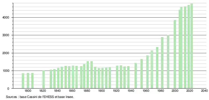 L'évolution du nombre d'habitants est connue à travers les recensements de la population effectués dans la commune depuis 1793. Pour les communes de moins de 10 000 habitants, une enquête de recensement portant sur toute la population est réalisée tous les cinq ans, les populations de référence des années intermédiaires étant quant à elles estimées par interpolation ou extrapolation[34]. Pour la commune, le premier recensement exhaustif entrant dans le cadre du nouveau dispositif a été réalisé en 2008[35].