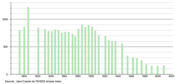 L'évolution du nombre d'habitants est connue à travers les recensements de la population effectués dans la commune depuis 1793. À partir du , les populations légales des communes sont publiées annuellement dans le cadre d'un recensement qui repose désormais sur une collecte d'information annuelle, concernant successivement tous les territoires communaux au cours d'une période de cinq ans. Pour les communes de moins de 10 000 habitants, une enquête de recensement portant sur toute la population est réalisée tous les cinq ans, les populations légales des années intermédiaires étant quant à elles estimées par interpolation ou extrapolation[5]. Pour la commune, le premier recensement exhaustif entrant dans le cadre du nouveau dispositif a été réalisé en 2008[6],[Note 1].