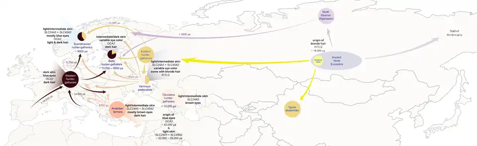 Selon une étude de 2020, l’arrivée des premiers agriculteurs européens (EEF) de l’ouest de l’Anatolie à partir d'environ 6 400 av. J.-C., ainsi que des pasteurs des steppes pontiques au cours de l’âge du bronze, a provoqué une évolution rapide des populations européennes vers une peau et des cheveux plus clairs[24].