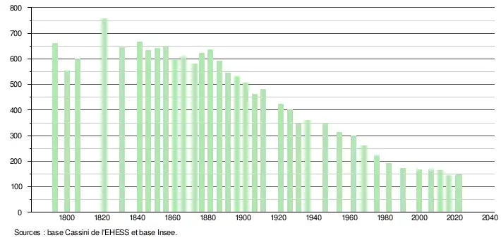 L'évolution du nombre d'habitants est connue à travers les recensements de la population effectués dans la commune depuis 1793. Pour les communes de moins de 10 000 habitants, une enquête de recensement portant sur toute la population est réalisée tous les cinq ans, les populations de référence des années intermédiaires étant quant à elles estimées par interpolation ou extrapolation[31]. Pour la commune, le premier recensement exhaustif entrant dans le cadre du nouveau dispositif a été réalisé en 2006[32].